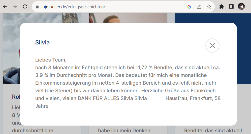 Oben genannter Philipp J. Müller wirbt auf seiner Website damit, dass schon mehr als 16.000 Menschen an seiner Ausbildung teilgenommen haben und es eine Zufriedenheitsquote von 96,7% Prozent gibt. Er hat also mindestens schon 64 Millionen Euro Umsatz mit diesen Coachings gemacht und nahezu jeder Teilnehmer (15.472) können „nachweislich Erfolge im Leben und an der Börse“ verzeichnen. Realistisch? Das Gegenteil kann ich ihm nicht beweisen, also muss es wohl so sein.