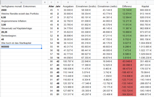 Will man nun (wie ich) möglichst früh in Rente gehen hat man folgendes Spreadsheet bei 900.000 Euro Startkapital.